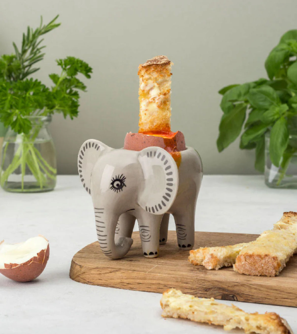Enhance your breakfast routine with Hannah Turner's adorable Elephant Egg Cup. Handmade in Sri Lanka from high fired ceramic, this 9 cm long, 9 cm wide, and 8.3 cm high egg holder adds "wild and rampant fun" to your mornings. Comes in a plastic-free cardboard box, making it the perfect gift for Elephant lovers.