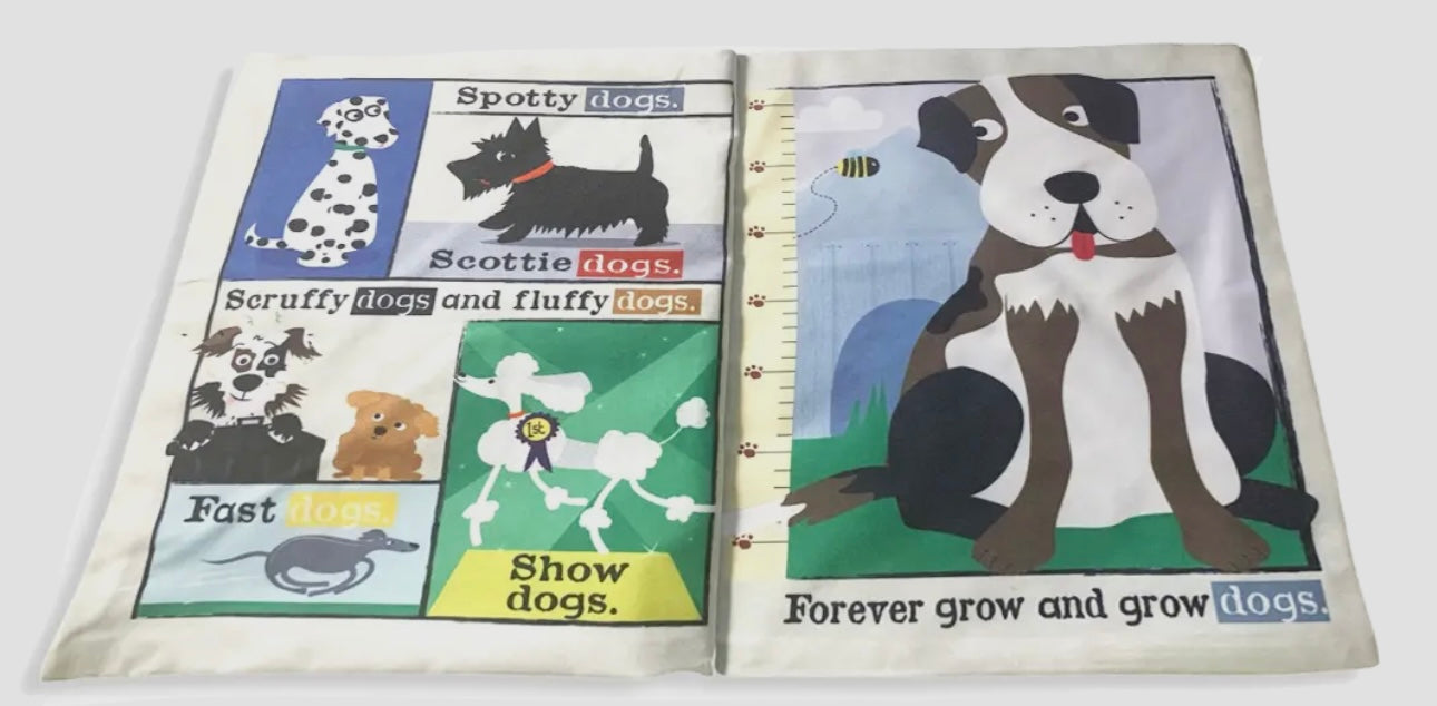 Nursery Times Crinkly Newspaper. Just Dogs. Simple and fun illustrated rhyming text describing different types of dogs. UKCA/CE tested and machine washable. A practical, lightweight cloth book with crinkly pages. A great sensory toy. A unique gift. Packed in a card envelope/