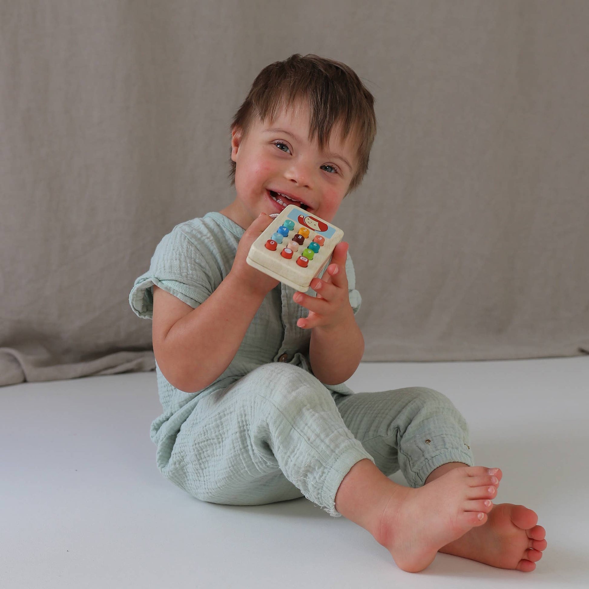 This pretend wooden mobile phone by Mentari has 12 squishy coloured buttons to press and an illustrated picture. It also comes with a cord handle.