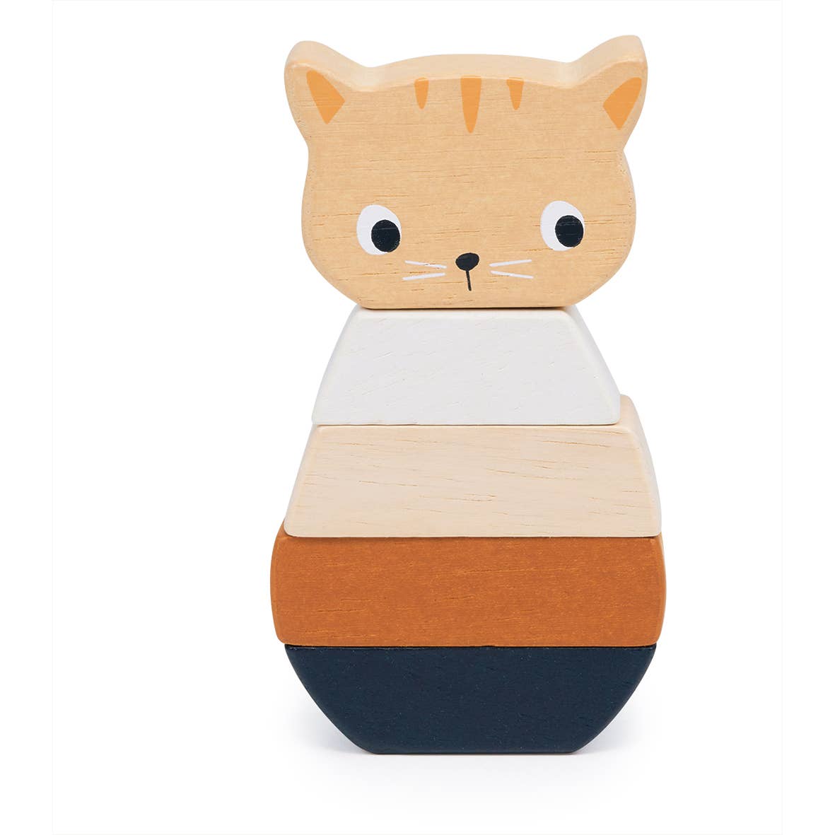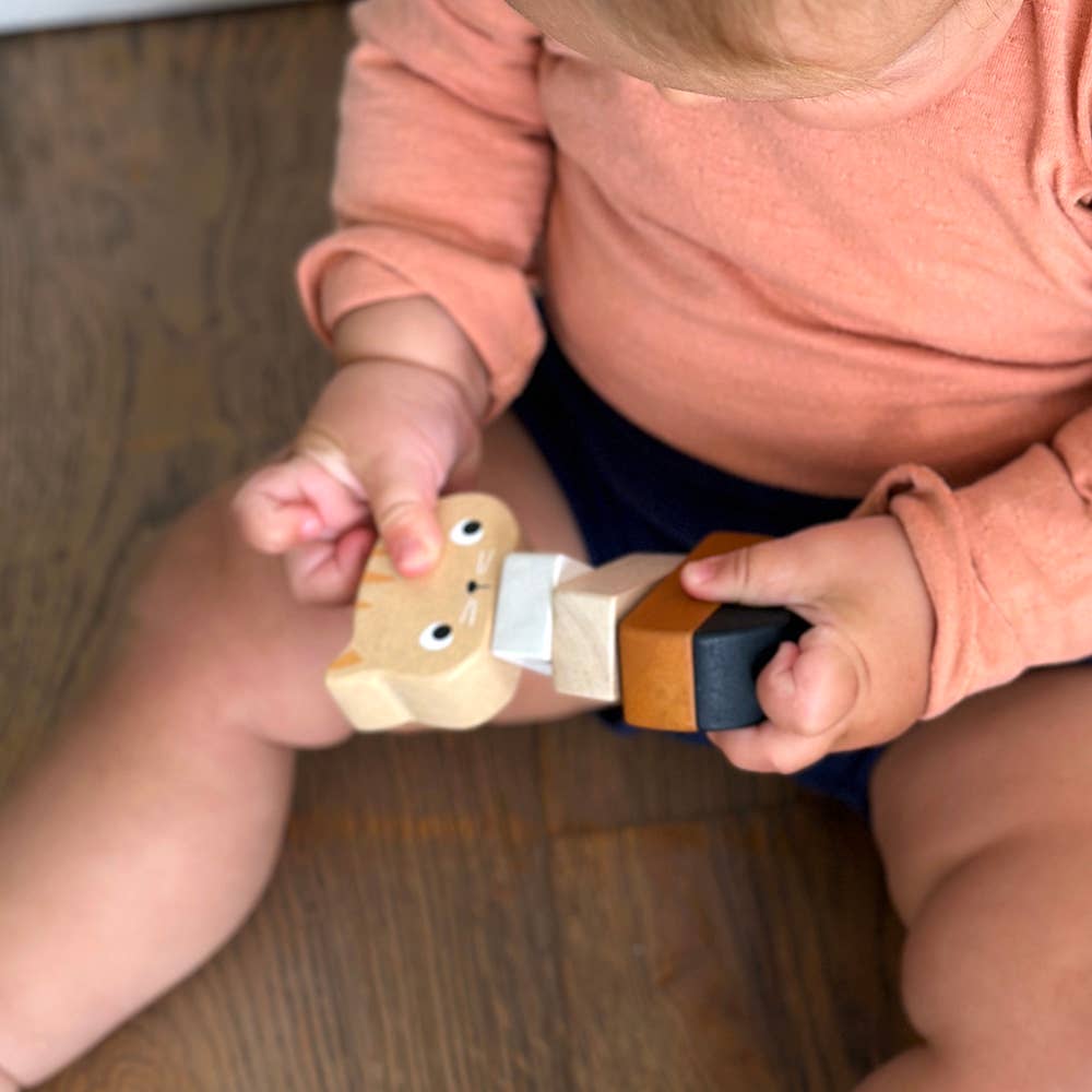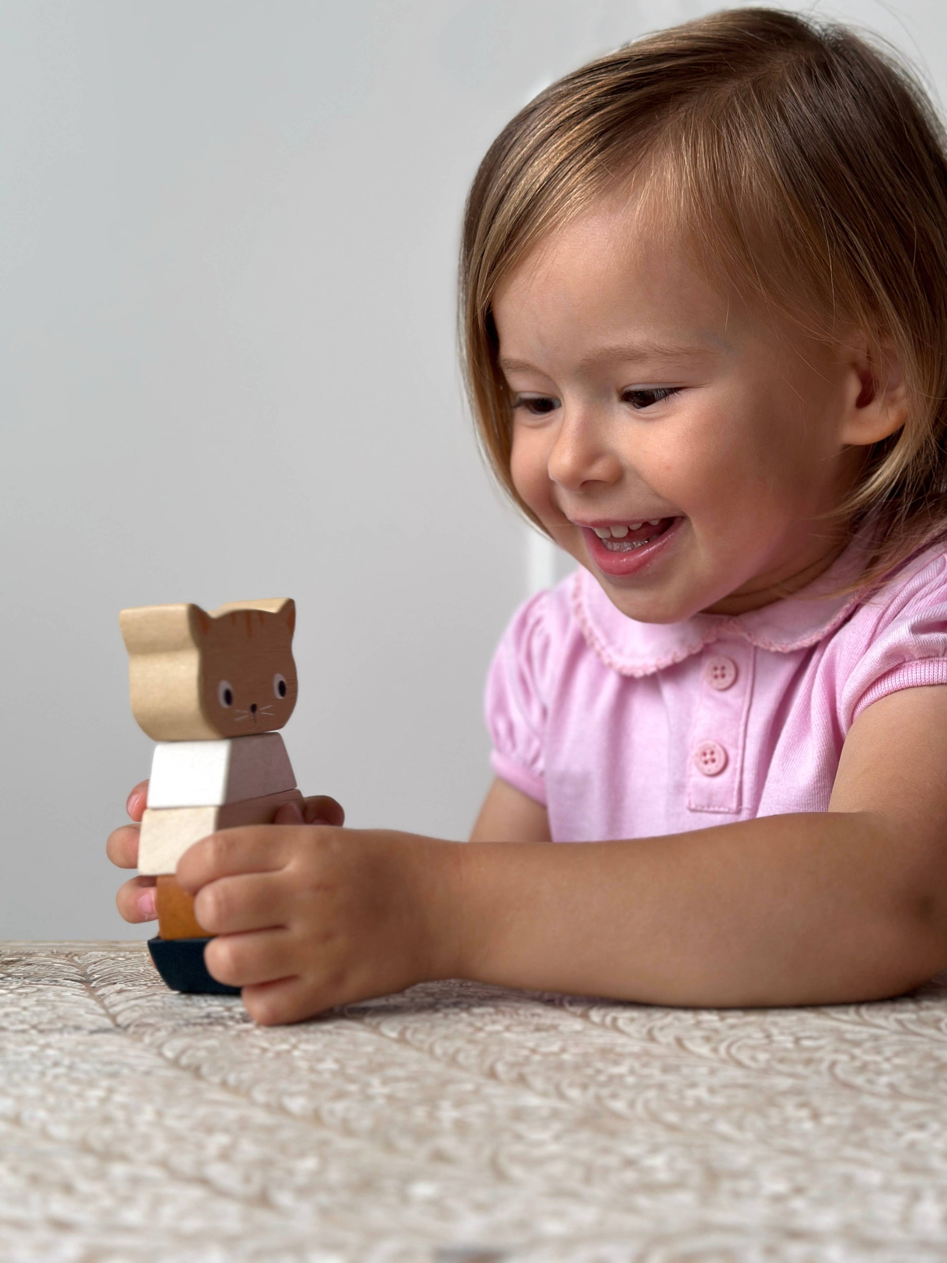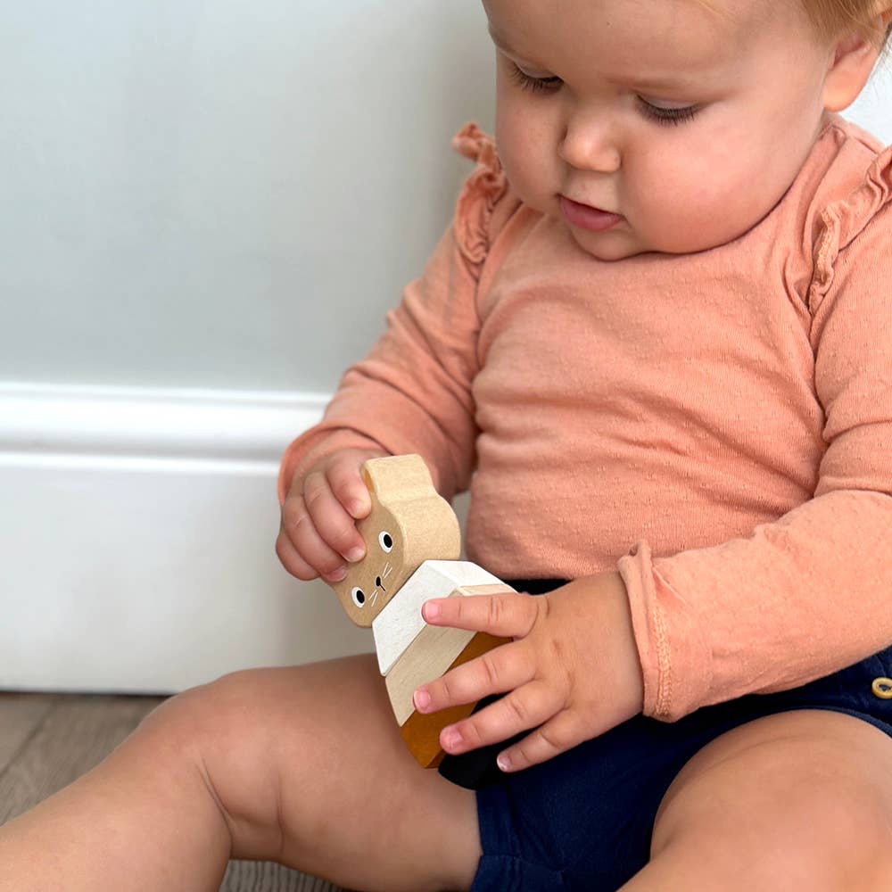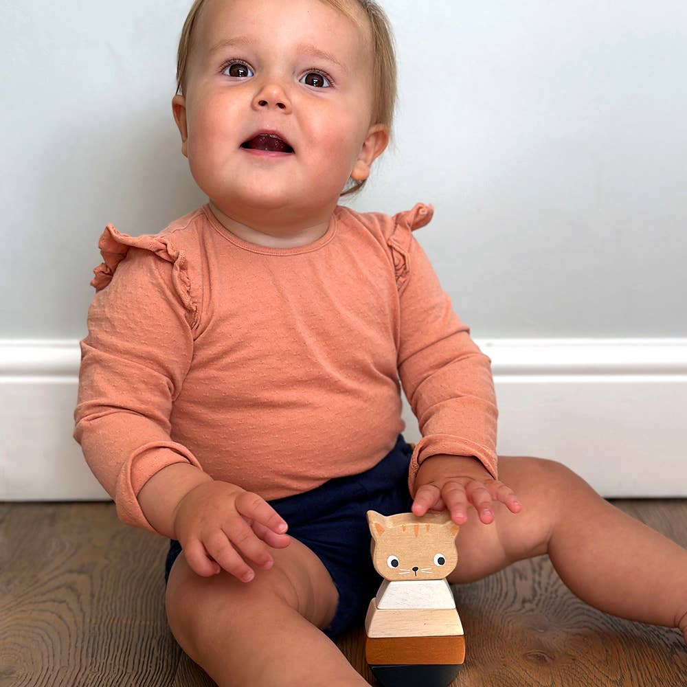 This wooden toddler toy by Mentari comes with a base peg and 4 coloured removable pieces for stacking. Decorated with a kitten face motif.