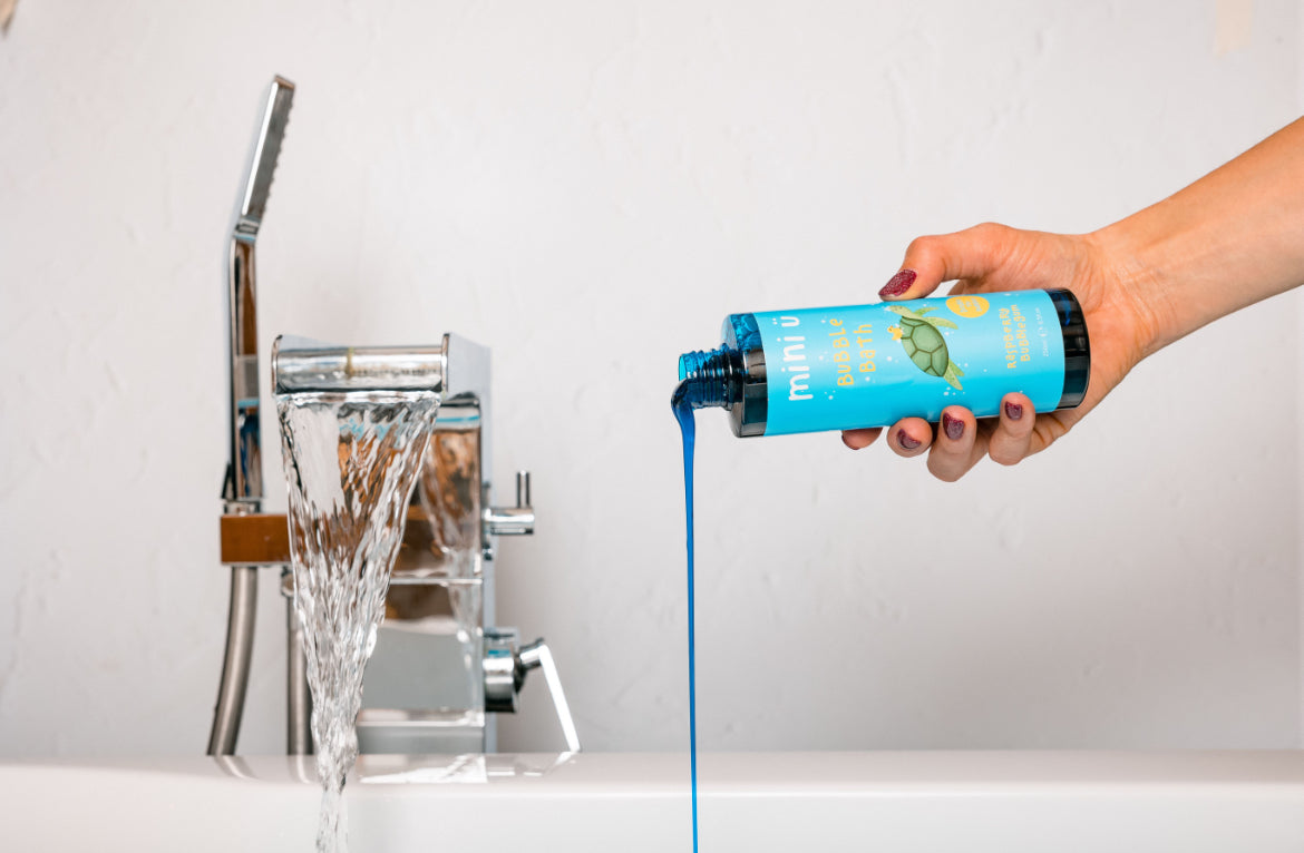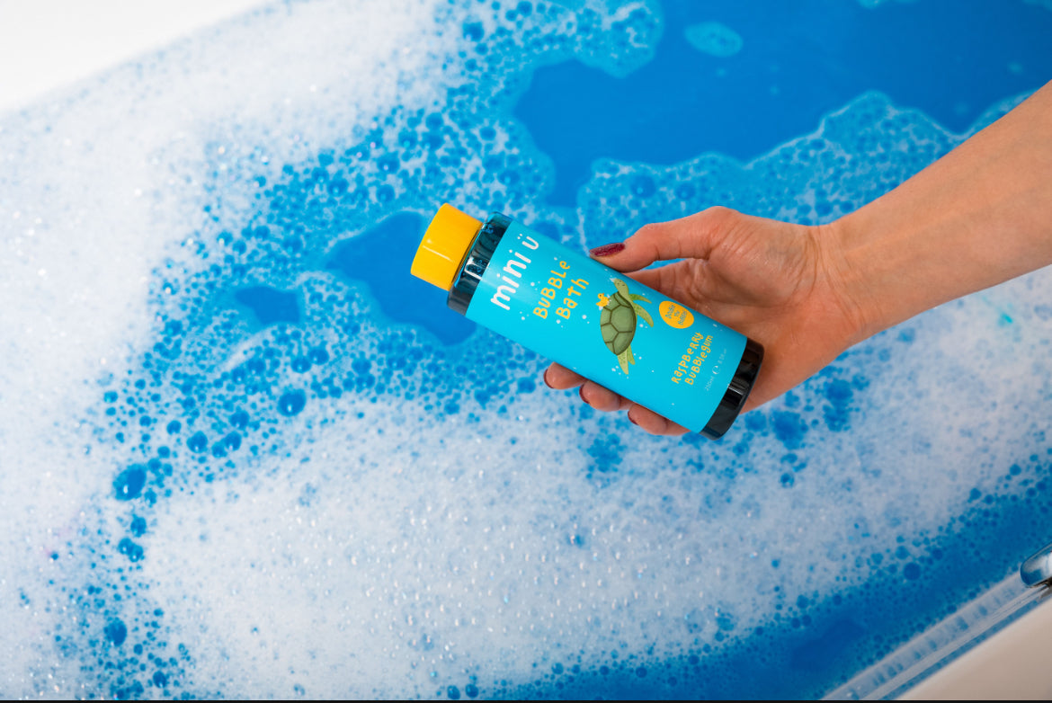 Mini U's Raspberry Bubblegum Bubble Bath for boys and girls, enriched with aloe vera leaf juice powder. This moisturizing and cleansing foaming formula is gentle on all skin types and transforms the water into a fun shade of blue. Simply pour into warm running water to create a colorful, bubbly bath with a sweet raspberry fragrance.