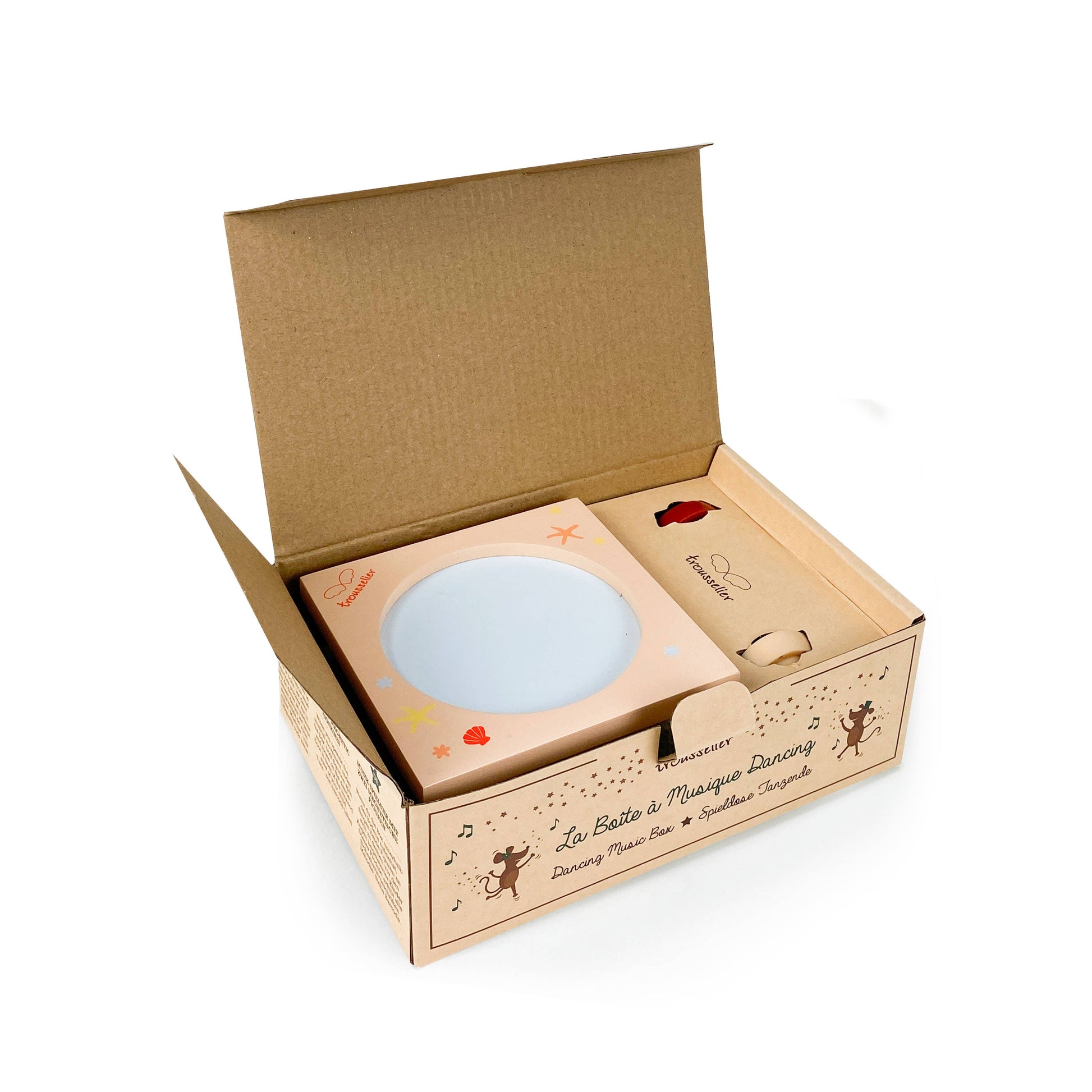 MUSIC BOX: This wooden music box will amaze your child with its 2 magnetic figures that rotate on the dance floor. Perfect for decorating your room & putting him to sleep easily. IDEAL FROM BIRTH: This musical set will be a great effect for decorating a child's room. An original birth gift full of poetry! TIMELESS: A music box is a timeless object that is treasured. Its melody and the memories that accompany it will remain engraved in the child's memory for a long time. SIMPLE OPERATION: Turn the key located under the box then place the figures on the magnetic “dance floor” to make them dance. A MAGICAL BRAND: Immerse yourself in the magical universe of TROUSSELIER with their music boxes, nightlights, soft toys, musical mobiles & other toys that will rock the childhood of your little ones. TROUSSELIER - Ocean - Dancing Music Box - 2 Removable Figures - Simple Operation - Twinkle Music